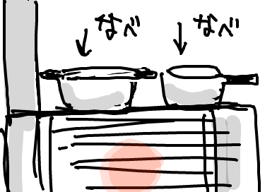 ガス台でヤカンとナベに湯を沸かし、ストーブの上でもナベで水を温める…